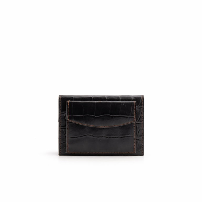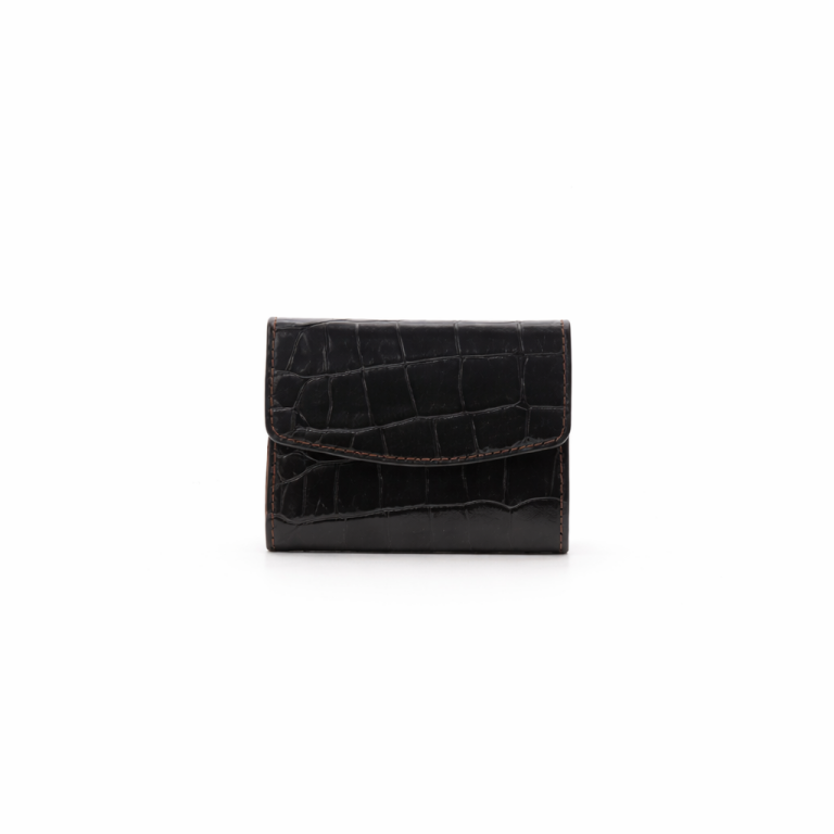 Carteira em pele efeito croco com duas divisórias principais: na frontal, um compartimento para notas e divisões com capacidade total para quatro cartões; na traseira, um compartimentos livre com mola de pressão. Aplicações prateadas e logótipo timbrado no interior.
