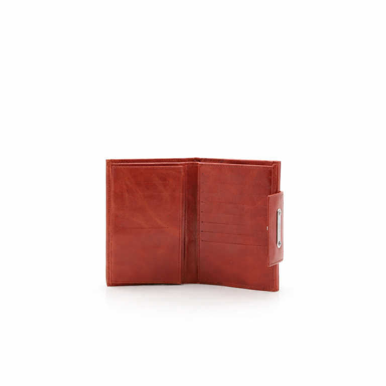 Carteira em pele com duas divisórias principais: na frontal, três compartimentos para notas, uma bolsa transparente e três divisões com capacidade total para vinte e um cartões; na traseira, dois compartimentos livres e um com fecho de correr para moedas. Aplicações e logótipo de metal prateado.