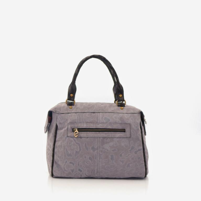 Mala em camurça média de duas alças de mão e uma alça a tiracolo amovível. Metade do painel frontal em pêlo de vaca. Fecho de correr no bolso principal e no traseiro. Três bolsos interiores. Logótipo de metal aplicado diretamente na pele.