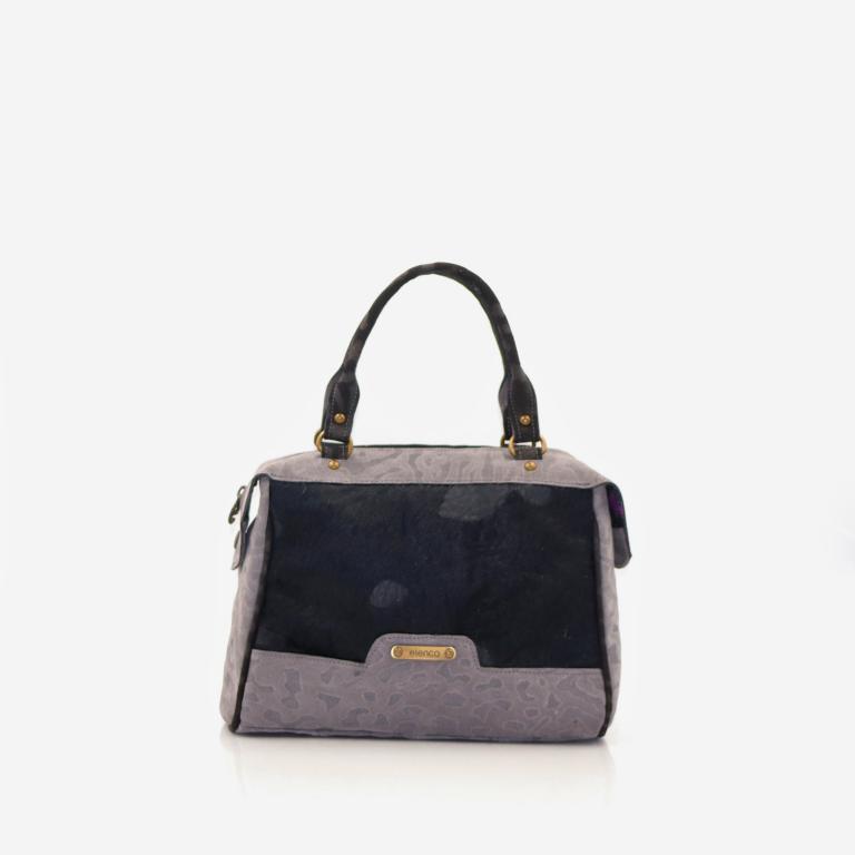 Mala em camurça média de duas alças de mão e uma alça a tiracolo amovível. Metade do painel frontal em pêlo de vaca. Fecho de correr no bolso principal e no traseiro. Três bolsos interiores. Logótipo de metal aplicado diretamente na pele.