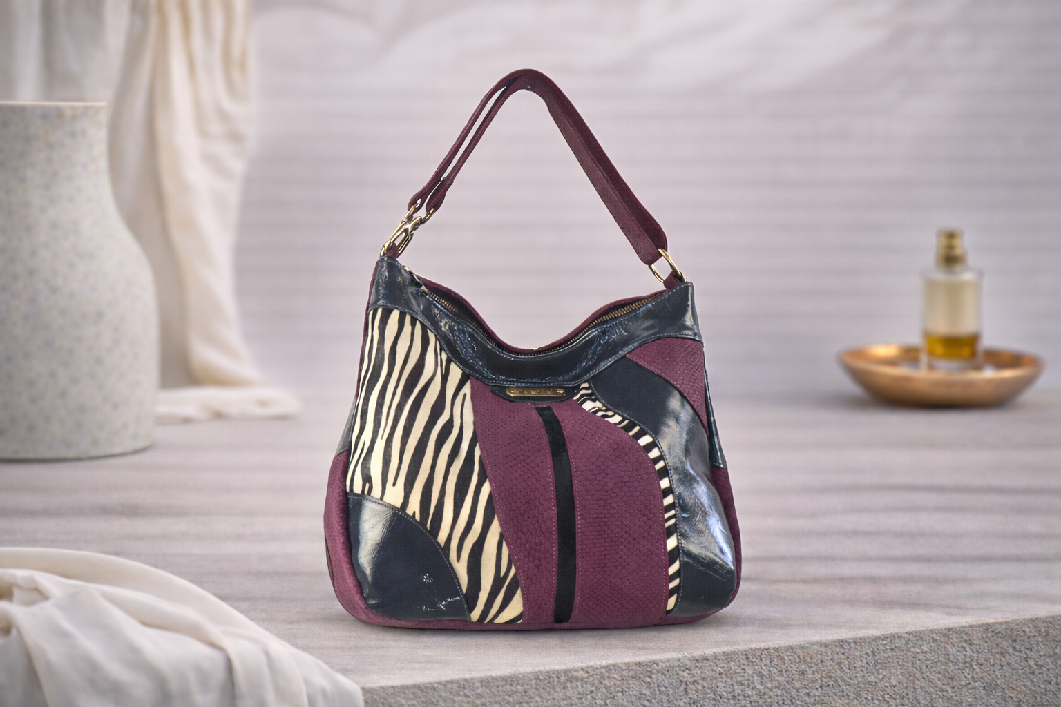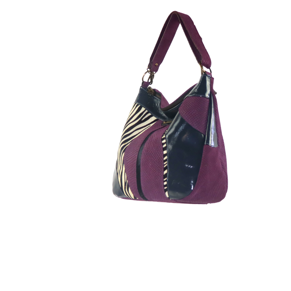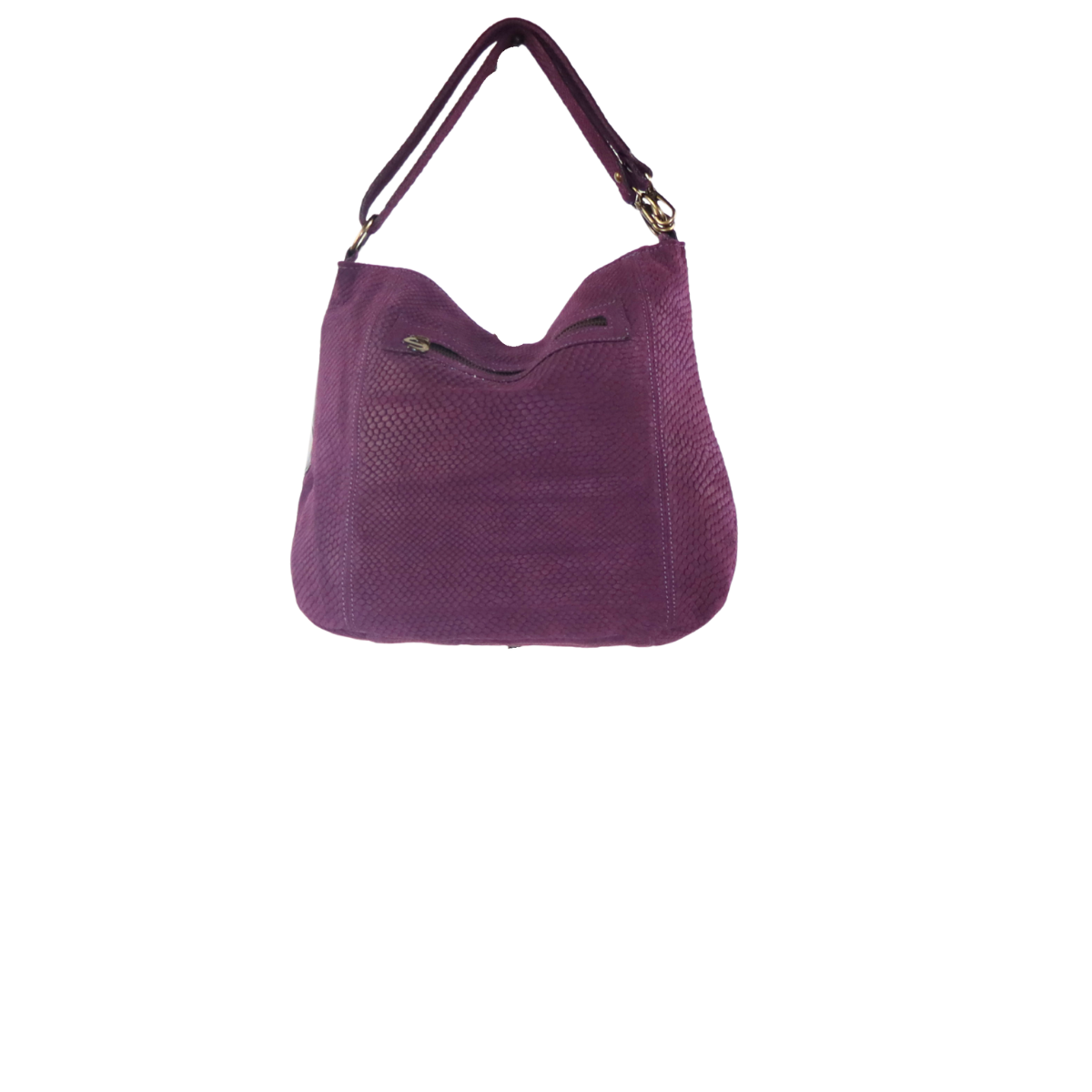 Mala em camurça média de uma alça biposicional de ombro. Fecho de correr no bolso principal e no traseiro interior. Logótipo de metal aplicado diretamente na pele.
