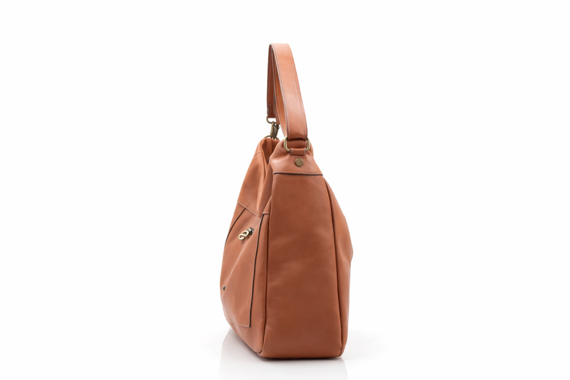 Mala em pele grande de uma alça biposicional de ombro. Fecho de correr no bolso principal, frontal e traseiro.Três bolsos interiores. Logótipo de metal aplicado diretamente na pele.