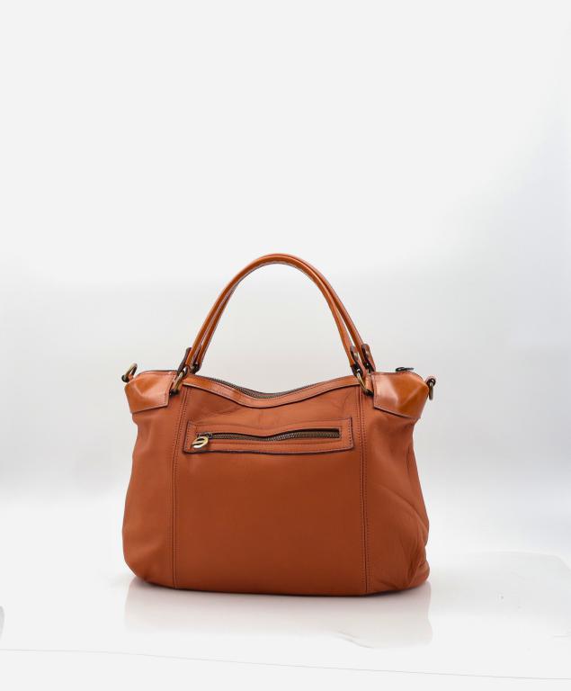 Mala em pele média de duas alças de mão. Uma alça a tiracolo amovível. Fecho de correr principal e no bolso traseiro. Mola magnética na aba frontal. Logótipo de metal aplicado diretamente na pele.
