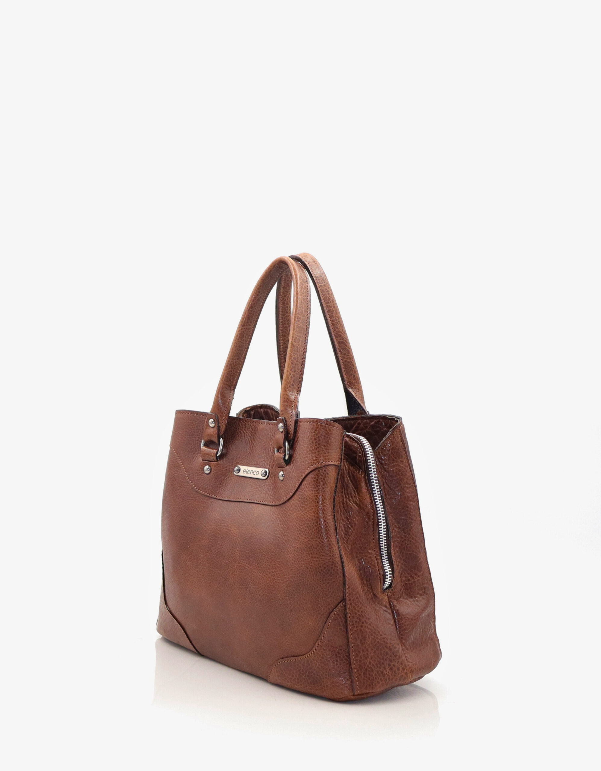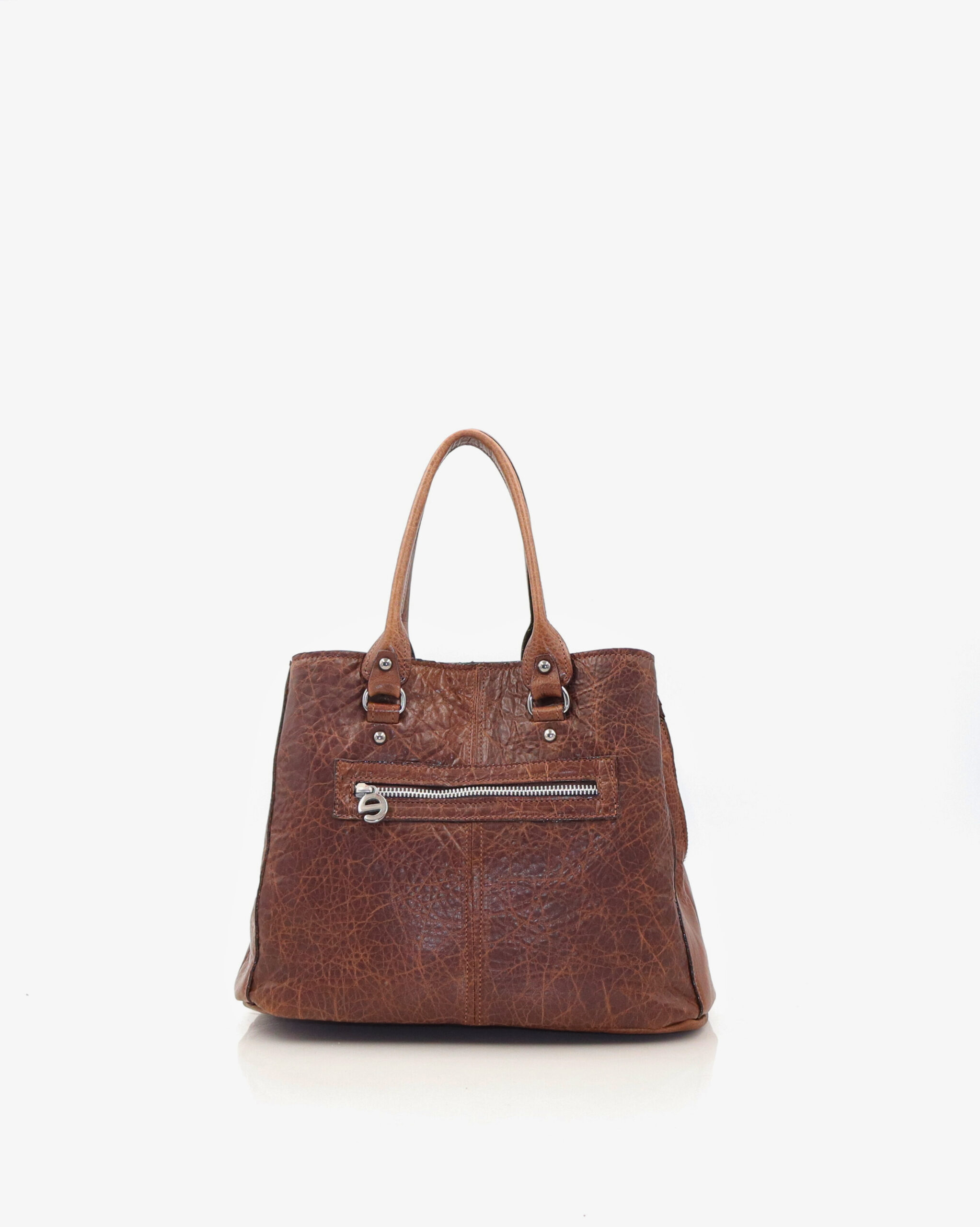 Mala em pele média de duas alças de mão e uma alça a tiracolo amovível. Fecho de correr no bolso principal e no traseiro. Dois separadores com mola magnética. Logótipo de metal aplicado diretamente na pele.