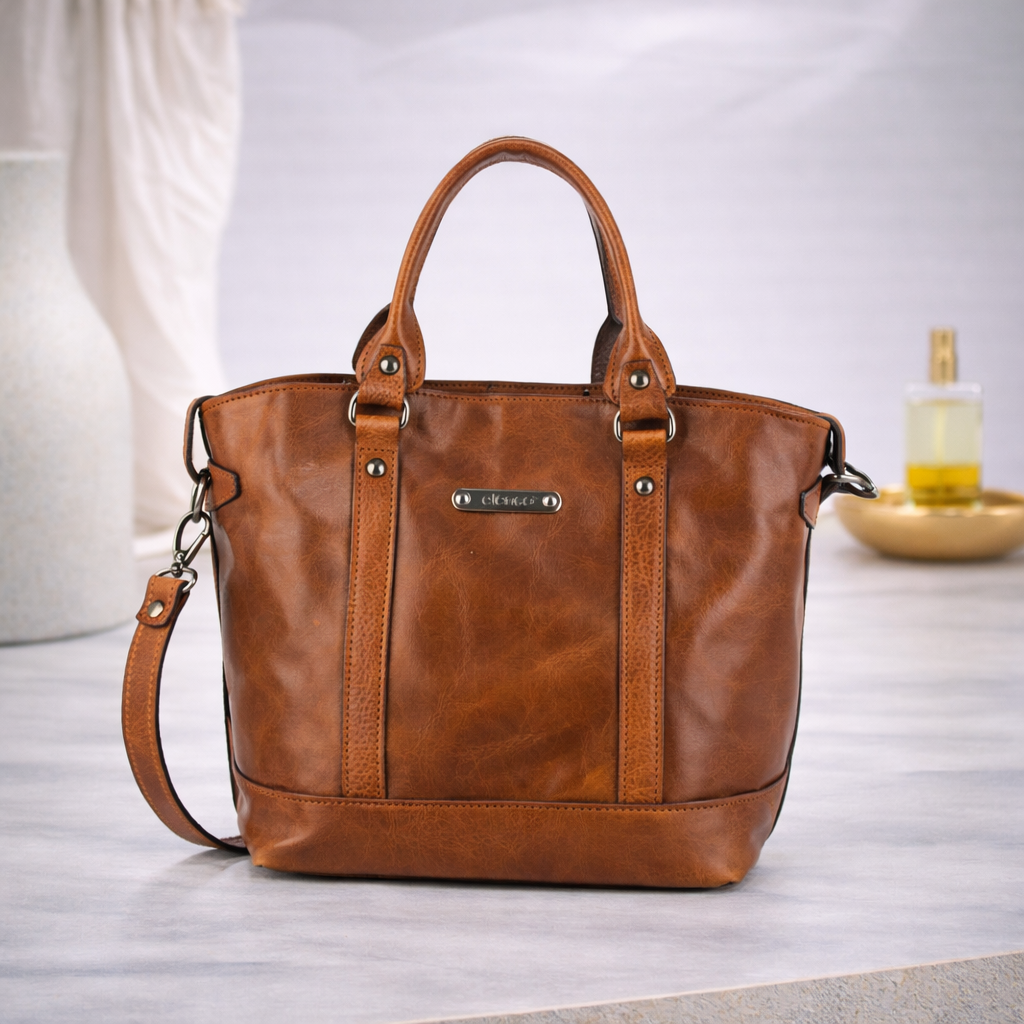 Mala em pele média de duas alças de mão. Uma alça a tiracolo amovível. Fecho de correr principal e uma bolsa fixa interior. Logótipo de metal aplicado diretamente na pele.