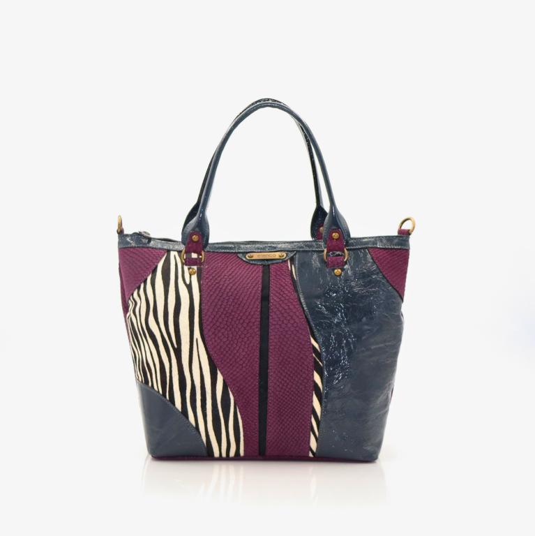Mala em pele média de duas alças de mão. Uma alça a tiracolo amovível. Fecho de correr principal e traseiro. Logótipo de metal aplicado diretamente na pele.