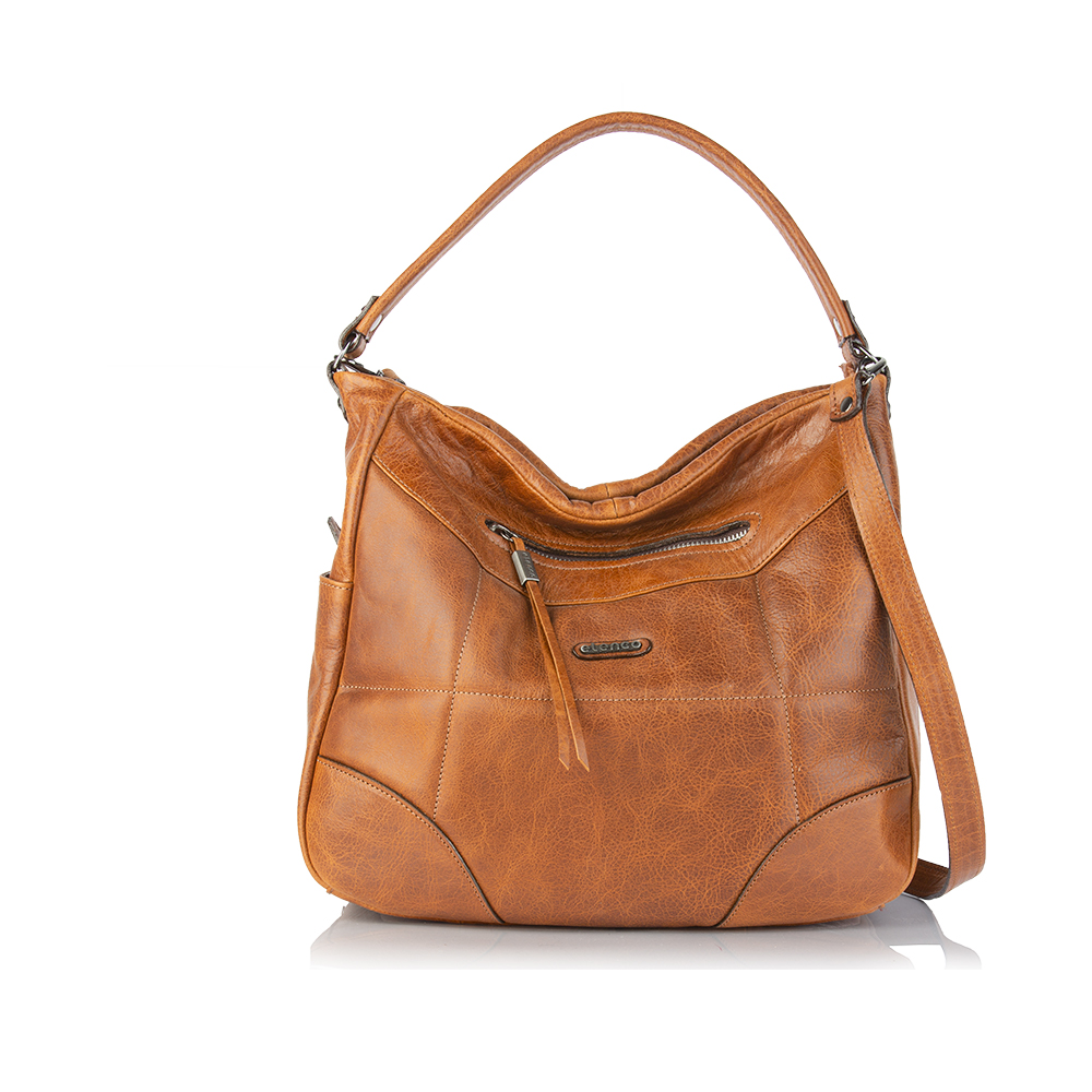 Mala grande de ombro de uma alça e outra a tiracolo amovivel. Um bolso frontal, outro traseiro e o principal, todos com fecho de metal. Três bolsos interiores e logótipo em metal aplicado diretamente na pele.