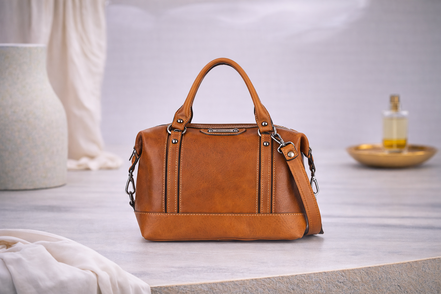 Mala média de mão com duas alças e outra a tiracolo amovível. Fecho de correr nos bolsos principal e traseiro. Três bolsos interiores. Logótipo de metal aplicado directamente na pele.