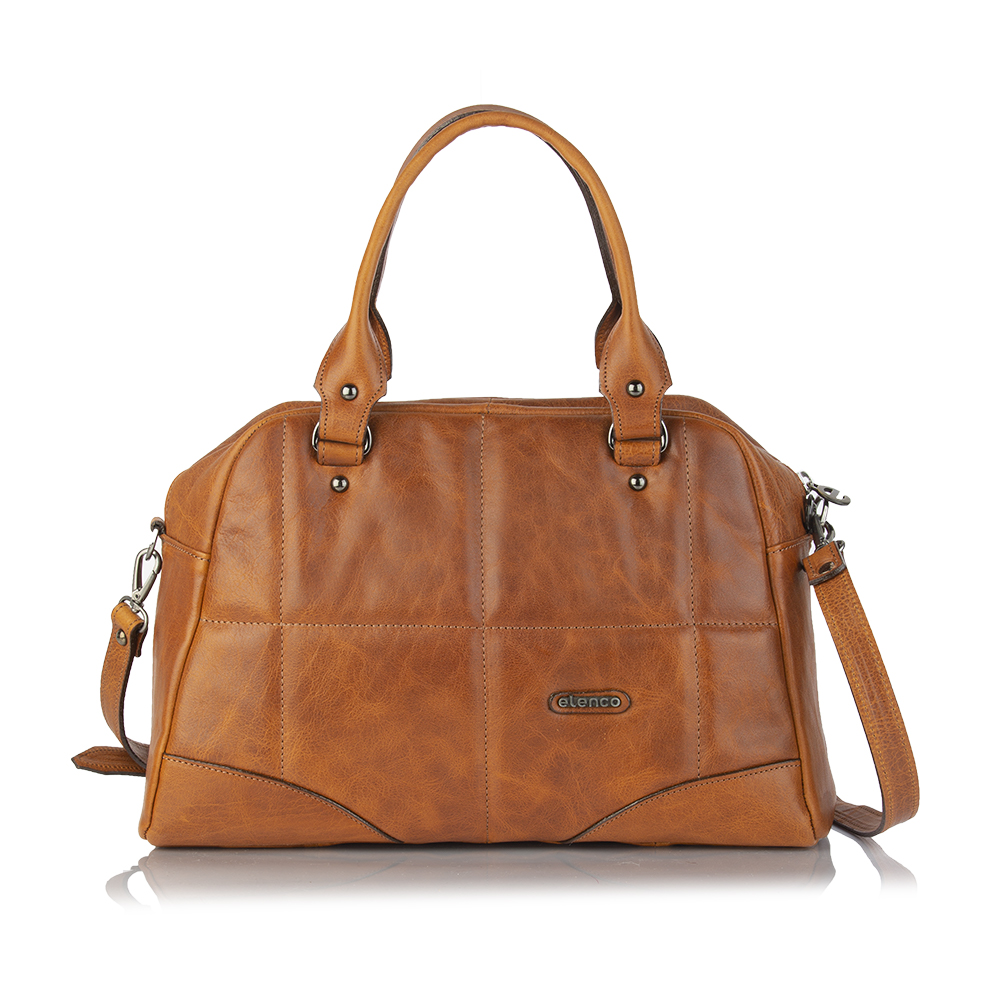 Mala média de mão de duas alças e outra a tiracolo amovivel. Um bolso frontal, outro traseiro e o principal, todos com fecho de metal. Três bolsos interiores e logótipo em metal aplicado diretamente na pele.