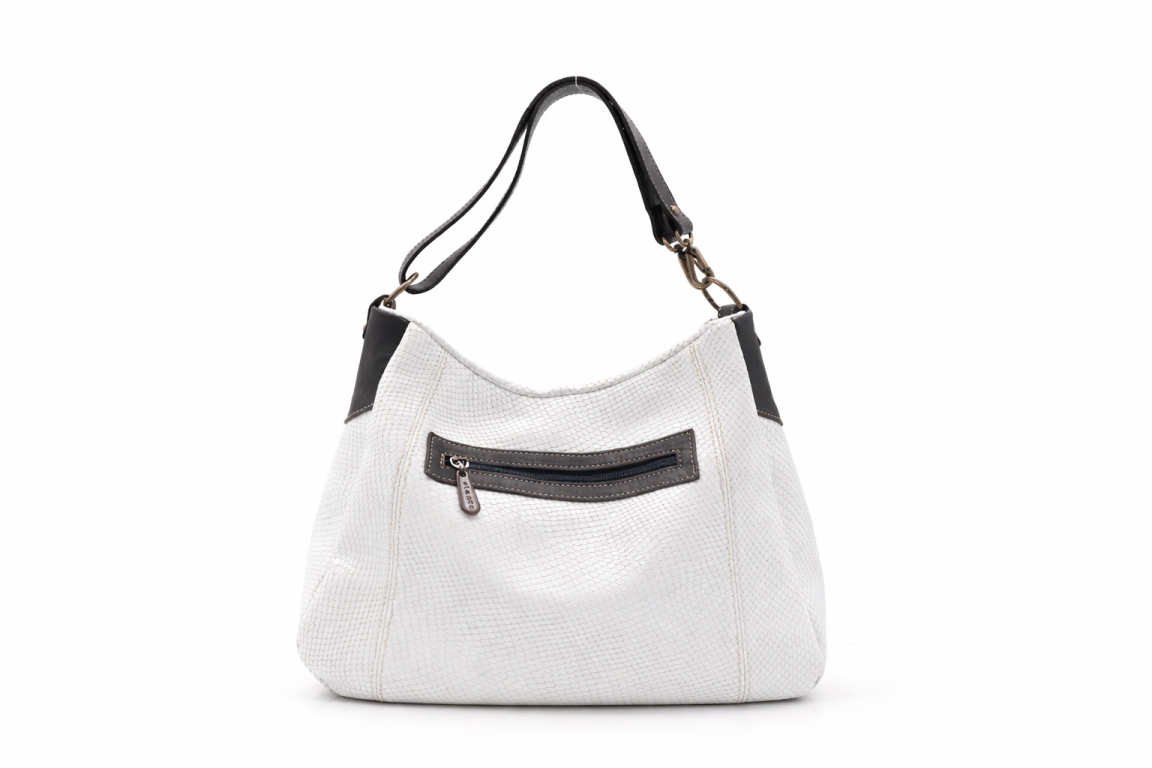 Mala média de ombro com uma alça biposicional. Bolso principal e traseiro com fecho de correr. Três bolsos interiores.