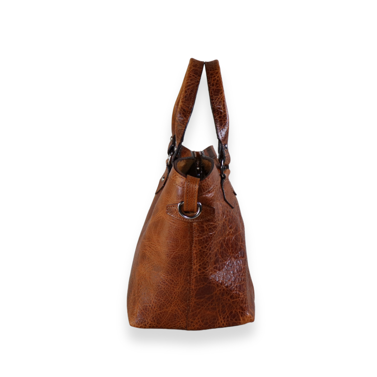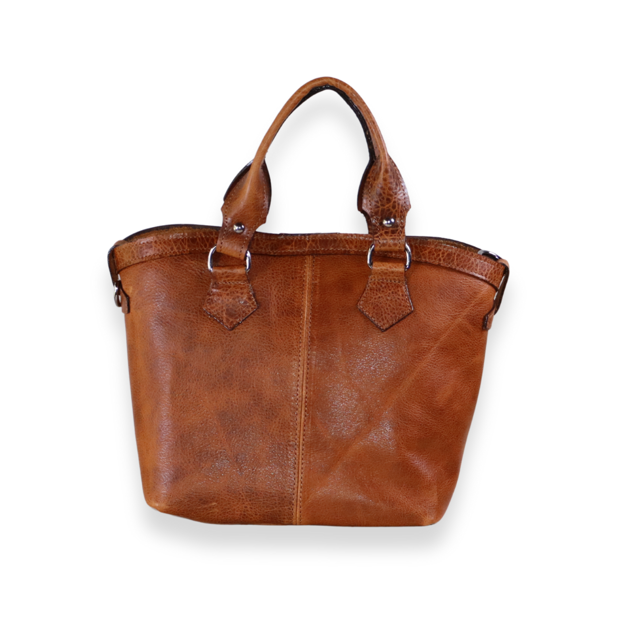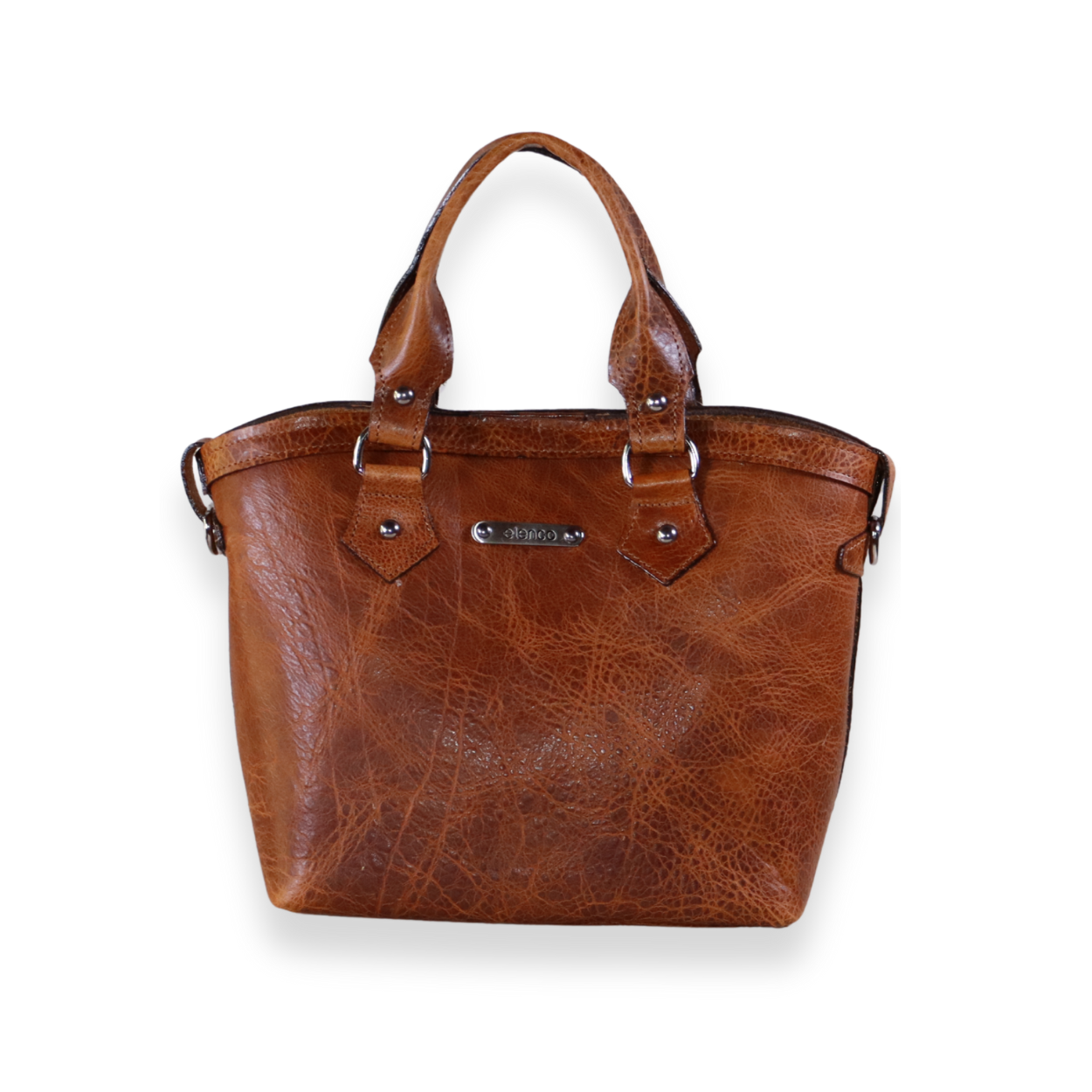 Mala pequena de mão duas alças e outra a tiracolo amovível. Mola magnética no bolso central. Um bolso interior. Logótipo de metal aplicado diretamente na pele.