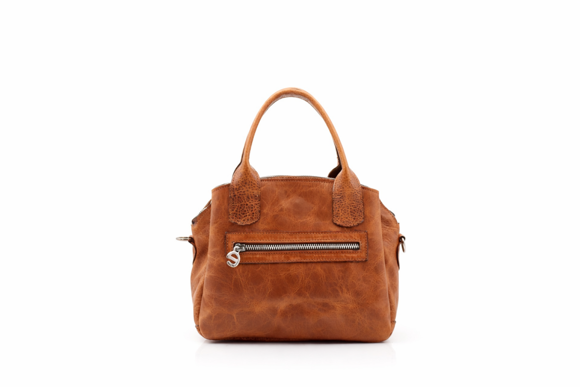 Mala pequena em pele de duas alças. Fecho de correr no bolso traseiro. Três divisórias: uma com fecho de correr e as outras com mola magnética. Logótipo de metal aplicado diretamente na pele.