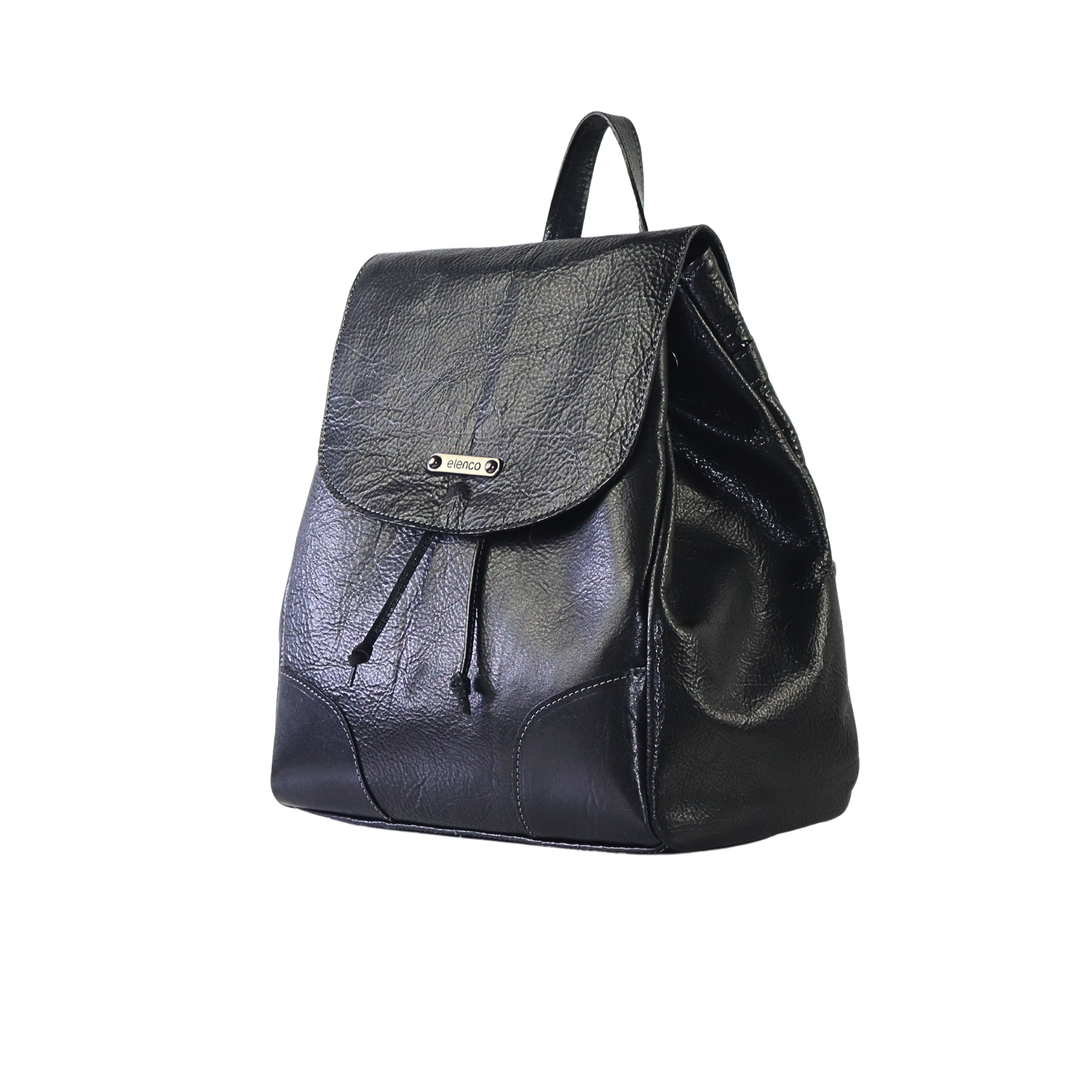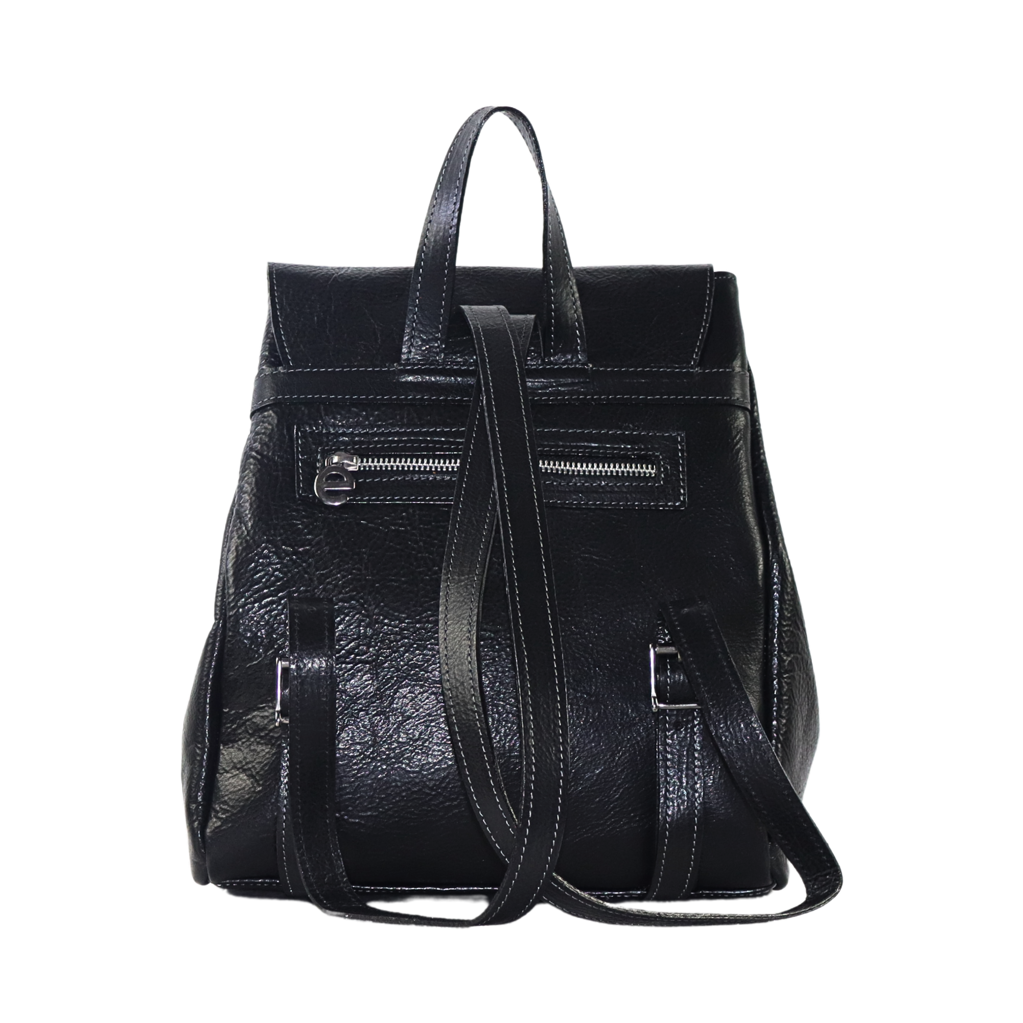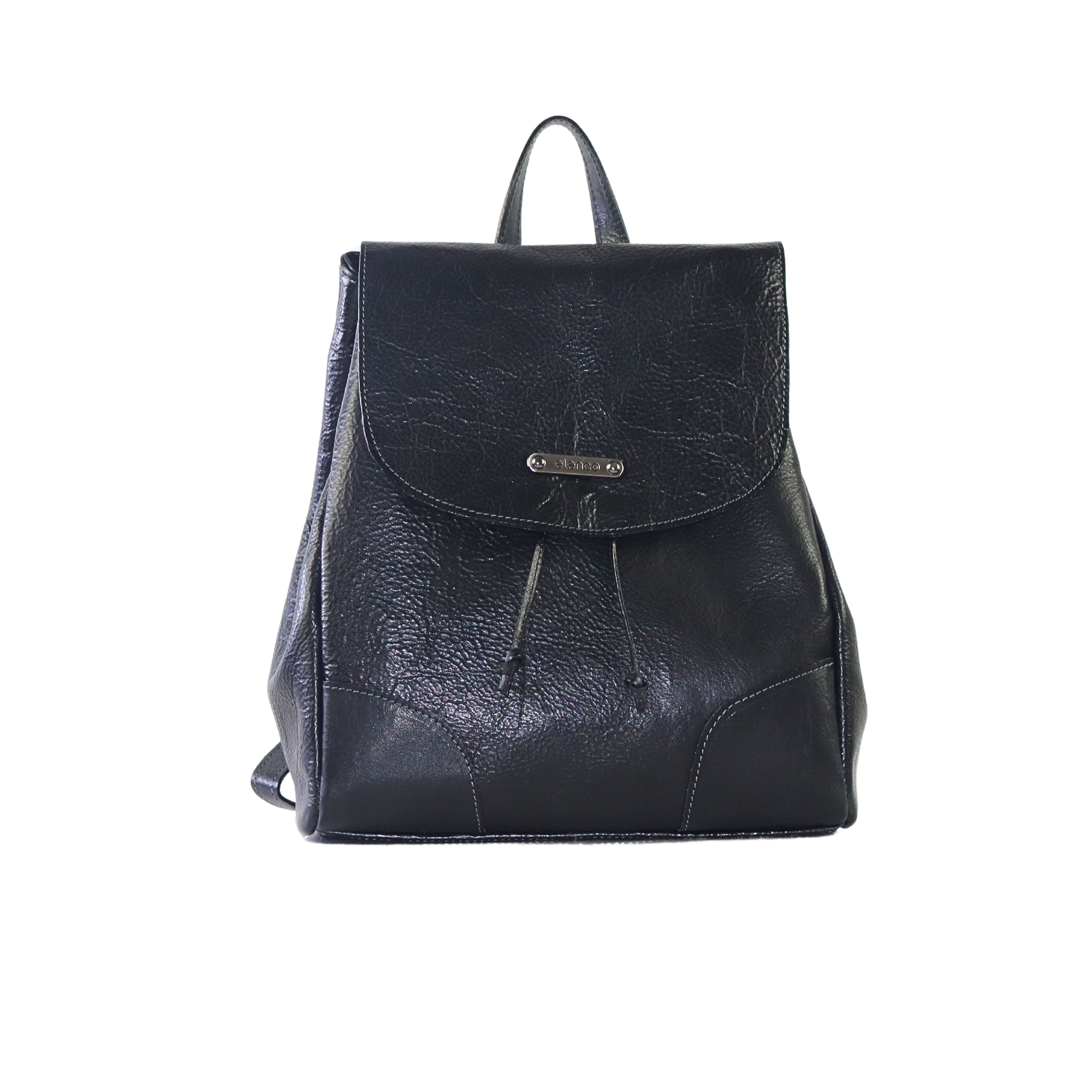 Mochila média com aba e fio de pele no fecho principal. Três bolsos interiores abertos. Logótipo de metal aplicado directamente na pele.
