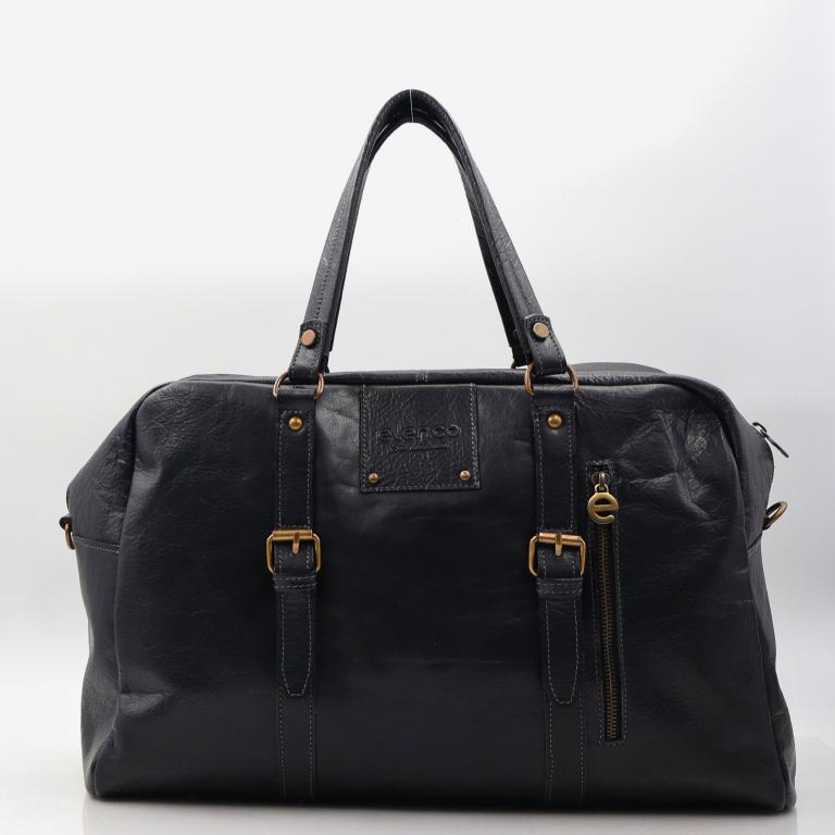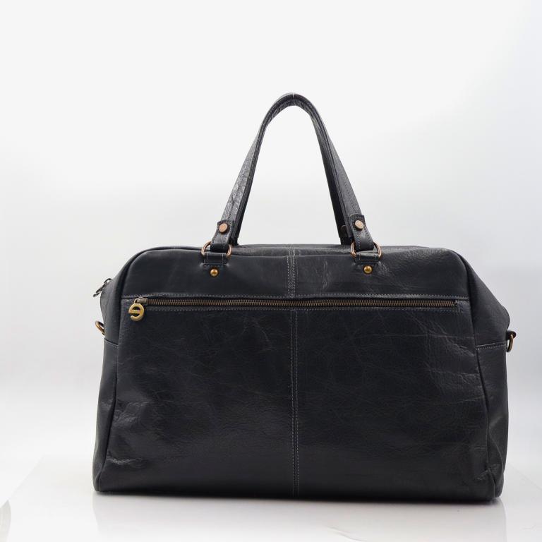 Weekend bag em pele preta de duas alças e outra a tiracolo. Fecho de correr no bolso principal, à frente e atrás.